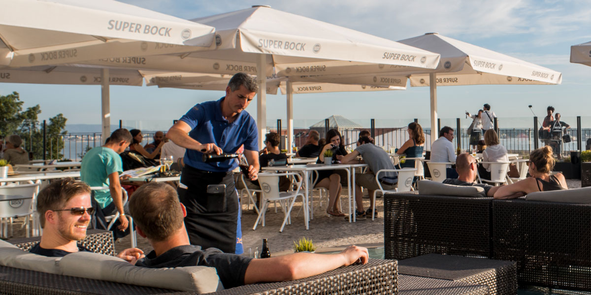 Valorizando o esplêndido enquadramento, a esplanada exterior de 300 m2 oferece um ambiente moderno e descontraído, ideal para finais de tarde. A decoração interior apresenta elementos emblemáticos da cultura portuguesa, entre os quais diversas peças de faiança Bordallo Pinheiro. Reforçando a ligação ao imaginário nacional, as refeições são servidas em loiça Vista Alegre.